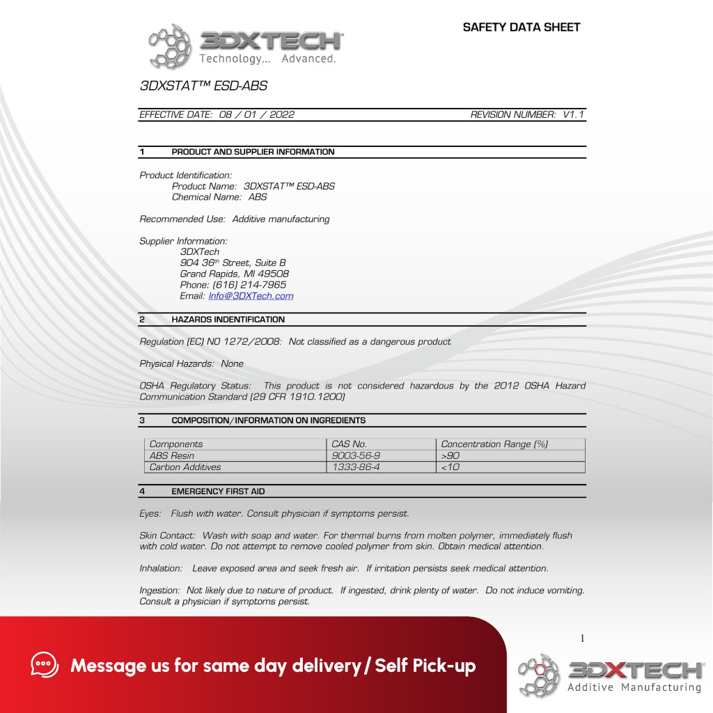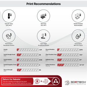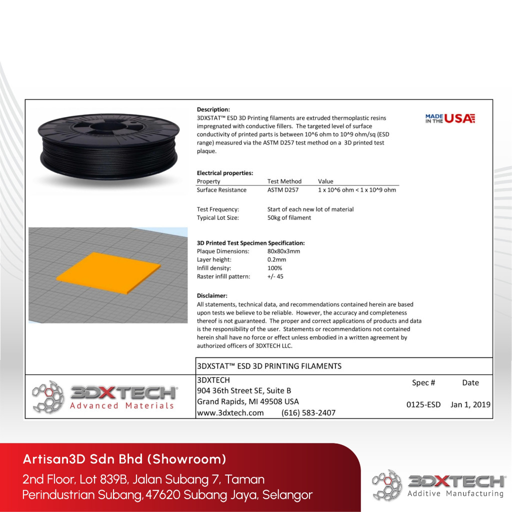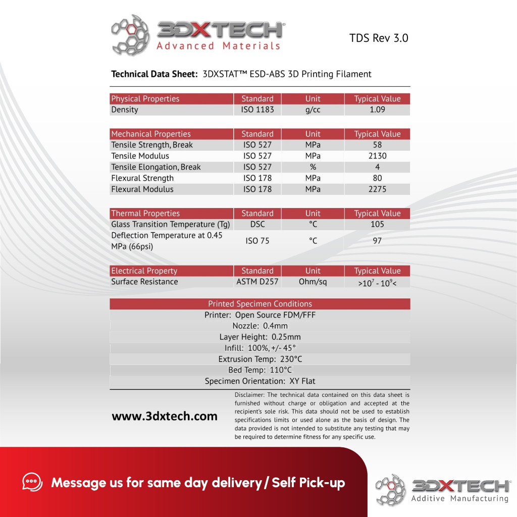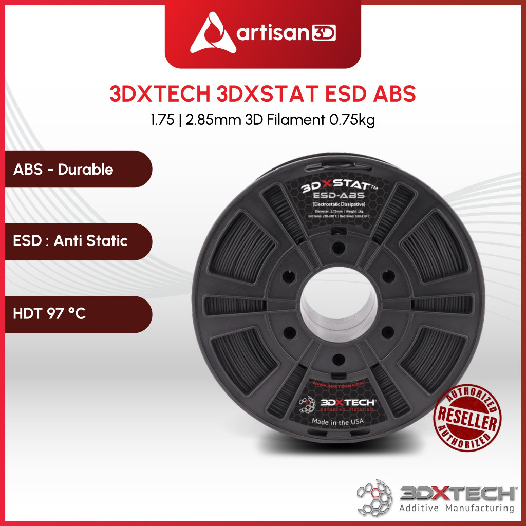 3DXSTAT ESD ABS is a high-quality, ESD-safe filament designed for 3D printing applications requiring electrostatic discharge (ESD) protection. Manufactured by 3DXTech, this filament combines premium ABS with a proprietary formulation of multi-wall carbon nanotubes, resulting in a material that is both easy to print and consistent in its ESD properties.